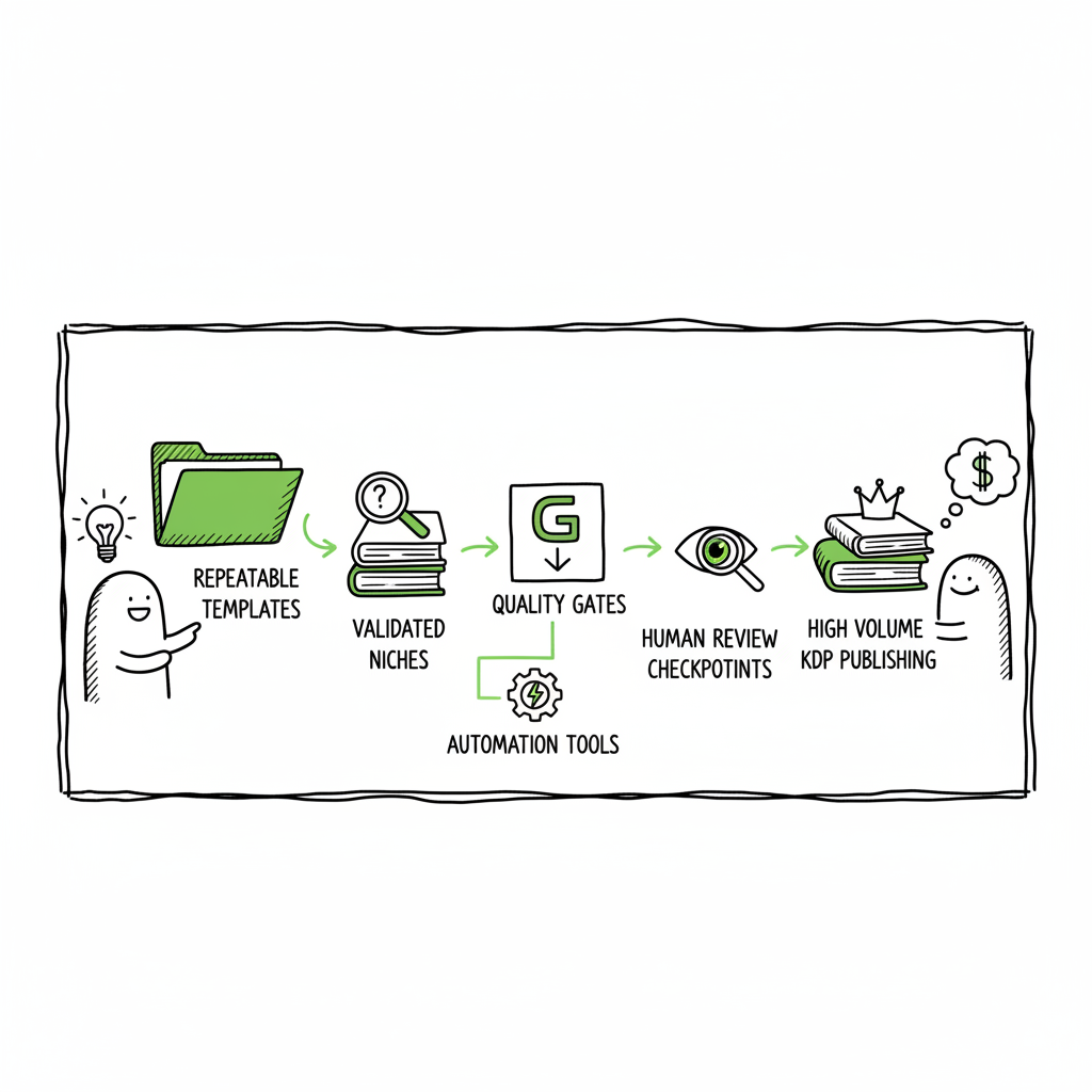- High volume KDP publishing succeeds when you treat publishing like a production pipeline: repeatable templates, validated niches, and clear quality gates.