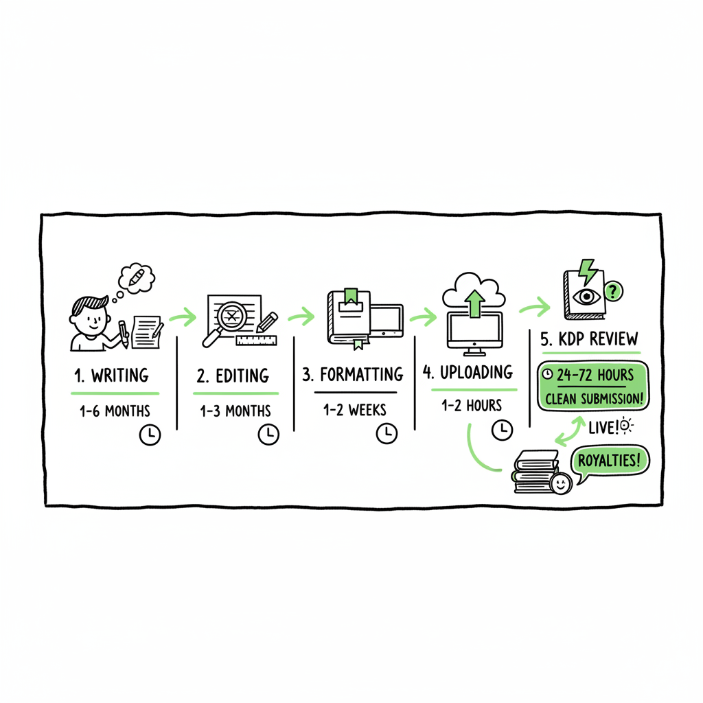 • The full self-publishing timeline (writing, editing, formatting, upload) is usually weeks to months; KDP review is just a part of that process.