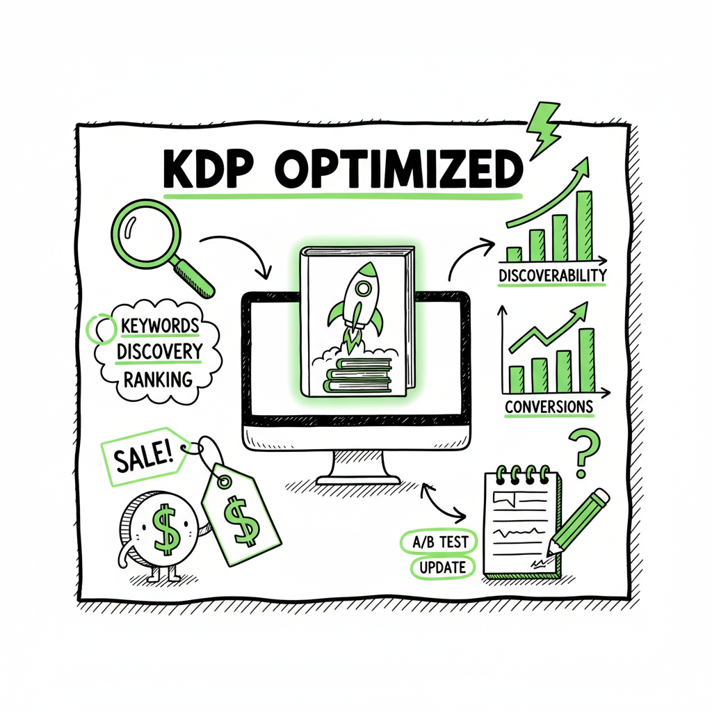 • KDP listing optimization means tuning title, subtitle, description, keywords, categories, price, and cover to improve discoverability and conversions.